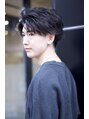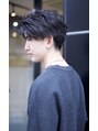少し前下がりの2ブロックに緩めのパーマで動きをつけたセンターパートスタイル。服装を選ばない万能スタイルです。