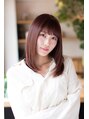 カットは鎖骨下のミディアム。自然に内巻きに入りやすいようレイヤーを入れて。カラーはツヤが出やすいピンク、ヴァイオレット系のブラウンにしています。トリートメントはディオーラムで最高級のツヤを出しています。
