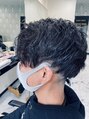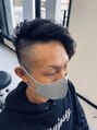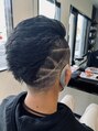 ブロック部分は 右片側を高めに刈り上げ トップ部分はフロントにかけて重さと長さを残してアシンメトリーに