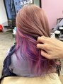 全体ブリーチから作るインナーカラーです。表面は淡いピンク・インナーはピンクと紫のミックスカラーです!ラフに束ねても可愛いスタイルです。ハイトーン/バレイヤージュ/ハイライト/髪質改善/グラデーション/デザインカラー/ロブ/ボブ/カット