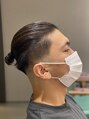 トップを長く残して刈り上げ部分はフェードカットで刈り込んでいくスタイルでマンバンヘアといいます。トップの部分はゴムでくくってとめてます。パーマを当てると大人の色気が出せるツーウェイスタイルにもなります!