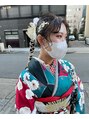 実際は肩くらいの長さのお客様ですが、巻きつけエクステで長さを出し、紐をぐるっと巻き付け、お飾りや金箔などで華やかに仕上げました。ポニーstyleや金箔、水引は今年のトレンドですし、パッと目を引くのでオススメです!