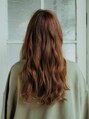 ふわっと波巻きロングスタイルです。全体的に重めのシルエットにし、巻いた時のふんわり感を重視しています。全体が重めのシルエットに対し、前髪を薄めに作ることで抜け感ができて、重くなり過ぎないスタイルに仕上げました。
