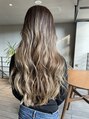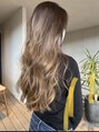 ロングのバレイヤージュヘアです。根元の伸びたところは地毛のまま生かし、毛先にかけて明るくなるグラデーションにしています。