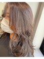 ハイライトをたっぷりいれて全体的にラベンダーグレージュで透明感を出しています!顔周りはくびれるように切り込んでいてスタイリングも楽なスタイルです!