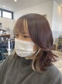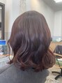 フレーム(お顔周り)はブリーチ後に紫系のカラーシャンプーで金髪のギラつきを抑えるのみにしてインパクトを残してあります。他全体はオレンジ系アプリコットブラウンで暖かみ、ツヤ感UPでコテ巻きとの相性かいい色味になっています!