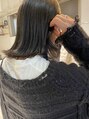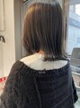 赤みのない透明感たっぷりアッシュグレージュカラー。暗めの髪色でも可愛いヘアカラーになっています。外ハネでオイルを使ったウエットな質感に仕上げています。