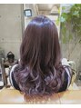 胸上のロングスタイルブリーチなしのイルミナカラーでラベンダーピンクに仕上げました。コテで無造作にカールをしっかり巻くことでカールが取れやすい直毛さんにも対応。