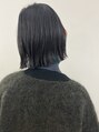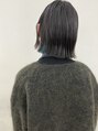 黒髪ぱつっとボブに襟足のインナーに水色のデザインカラーをいれたスタイル。水色はブリーチ×2 カラーをいれたトリプルカラーです。