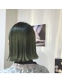 ブリーチ後に、淡いペールグリーンに青みを少しプラスして落ち着いた中にも淡い柔らかさを♪根本はシャドールーツで染めることで、毛に束感と動きを常に感じれるように。