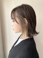 ○切りっぱなしボブスタイルです。【スタイルは、ブックマークをしてご提示よろしくお願い致します】仕上げに、コテで外巻きにしています!カラーは、インナーカラーでグレージュ系に派手になり過ぎず、ポイントは前髪のシースルーバンクでオシャレに!