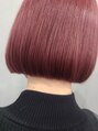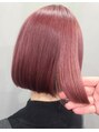 1度ブリーチをしたベースに柔らかいピンクをON!!赤すぎず、紫すぎないピンクにしたのがポイント♪カットはワンカールで自然にまとまるアゴラインのフラットボブ。※履歴や状態によってブリーチの必要回数が異なります