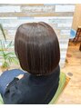 肩上の前下がりワンレンボブ。根本のリタッチカラーして、流して、酸熱トリートメント。中性の還元剤配合処方で。強髪プログラム。ヒト幹細胞培養液で肌、細胞を活性化。髪、地肌への最高ケア。