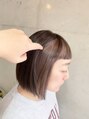 前髪からもみあげまでブリーチし、グレージュカラーをオンカラー。前髪短めのぱっつんボブです。