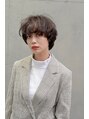 マッシュショートのベースに束感の可愛いパーマで柔らかい雰囲気のショートスタイルです。カラーは赤味を抑えたアッシュブラウンカラーで暗くても透明感が出てオススメです。