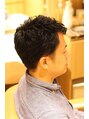 ツーブロックで短くしたいけど、直毛でサイドは浮きやすく、トップには自然なカールが欲しいので、アイロンパーマをしてあります。