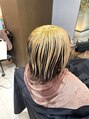 ブリーチ、暗染め、縮毛矯正、を繰り返しているお客様。またハイトーンカラーにしたいとのオーダーでしたが、全体をブリーチするのは少しダメージが心配・・・。そこで、表面の髪(画像2枚目)のみブリーチさせて頂き、それ以外はダークブラウンに。