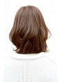 レイヤーを少しいれ、パーマで動きをつけたセミミディアムスタイルです。毛先と中間に太めのロッドを用いて巻き、ボリュームを出しつつ束が重ならないようにして動きをだしています。