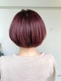 鮮やかなベリーピンクのショートボブ個性的で可愛い☆バングは真ん中から八の字に流してサイドバングをぴょんと外ハネにした韓国風。
