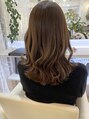 顔まわりにかけて、滑らかなラウンドのレイヤーを入れたカットです。正面から見ても重く見えにくくおすすめ!カラーはオリーブとベージュをミックスしています。