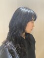 ロングスタイルにトップにレイヤーをいれたウルフ風スタイルです。ゆるくパーマをかけてくせ毛っぽくしています。もみあげもポイントで短くカットしています。