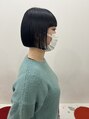 黒髪のぱつっとミニボブカラーは暗めのブルーブラックカラーにラインをキレイにだしたぱつっとボブ。前髪はワイドバングでオン眉にし、モードな雰囲気に。、
