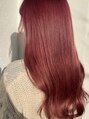 ピンクレッドの艶カラーと毛先パーマが大人可愛いフェミニンロングスタイル。かきあげ前髪でグラマラスに。切りっぱなしボブや前下がりボブ、くびれミディやエアリーミディなどからの伸ばしかけに。黒髪や暗髪のワンカールストレートからのイメチェンにもOK。