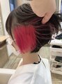 丸みのある前下がりショートです♪カラーはベースはそのまま黒髪で耳周りだけブリーチしてピンクを被せました!ベースをカラーしてないので伸びてもプリンを気にしなくて良いです!半年ぐらいはイヤリングカラーが楽しめますよ♪