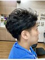 爽やかショートパーマスタイルです。髪が硬く毛量が多い方は、アレンジしずらい、重く見えるというのが悩み。毛量をしっかり調整して、パーマでウェーブを出すと、柔らかな雰囲気に。更にツーブロックにする事でスッキリとした爽やかなイメージになります。