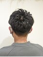 メンズのパーマスタイル。 刈上げとツーブロックでさっぱりと。トップのパーマでストレートヘアからイメージチェンジを♪スタイリングもお手軽に格好良くなりました。