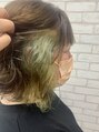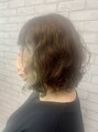 首が半分くらい隠れるぐらいの長さで前下がりの ゆるふわボブのスタイルです。ベースはカーキベージュに明るくしつつ、同時にイヤリングカラーの部分をブリーチで明るく塗り分けています。ブリーチ部分はシャンプー台にて色味をプラスして仕上げています。