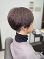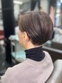 全体を丸みのあるラウンドボブにカット、襟足をスッキリさせる為に刈上げます。全体をブラウン系のカラーでナチュラルにトーンアップします。頭の骨格を綺麗に見せ、お手入れ簡単ヘアです。