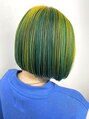 グリーンとイエローのコントラストがお洒落なミニボブスタイルです!ハッキリとした色味の割合のバランスでお洒落に仕上げたスタイルです。最初の色味が濃いので、長く色落ちを楽しむことができます!髪質やカラー履歴によりますが、ブリーチ2回必要です。