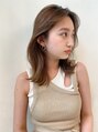 鎖骨ラインでプツッと、顔まわりはバングから繋がる小顔くびれレイヤーでワンカールで可愛く。カラーは全体に細かくハイライトを入れて透ける【シアーベージュ】に。ストレートでも巻いても立体感のある抜け感ヘア。