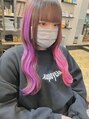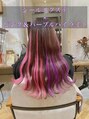 2色のカラーエクステを利用したツートーンハイライトのスタイルになります!ベースは地毛のカラーに合わせたナチュラルブラウンにして、ピンクとパープルを左右に分けてハイライトにしています。