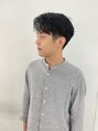 メンズの韓国風マッシュヘア。コンマヘアっぽいスタイリングで元々の当たっているパーマをいかしたスタイルです。