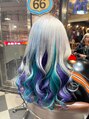 巻くとインナーカラーのストライプが見えてめっちゃかわいい!トップのホワイトも紫シャンプー使用でシルバー保てる+色落ちしてもかわいいブロンドになります!ケアブリーチ使用、トリートメントでハイトーンでも綺麗なロングヘアを維持していきましょう◎