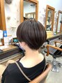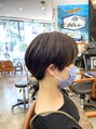 耳が出る長さのマッシュショート。前髪は眉下くらいです。襟足はスッキリ少し刈りあげ。カラーはヴェールがかったベージュブラウン。