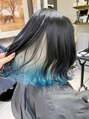 ダメージを予防するトリートメントをしながらインナーをブリーチ2回してホワイトのベースを作った後に水色のカラーバターでインナーの毛先を染めています♪