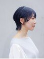 ショートヘアだけど襟足は長めに残すショートウルフです。面長がカバーできます。顔まわりは小顔に見えるカットにしています。カラーは深みのあるネイビーブルーに。