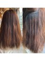 ほとんど地毛の状態ですが、毛先の数cmは矯正部分が残っている感じがします。普段からコテやアイロンも使われているので、特に毛先部分はデリケートな状態。根本から中間部分と毛先で薬剤を2種類に分けて塗布していきます。