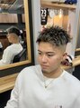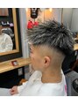 前下がりアップバングスタイルです。刈り上げはスキンフェードに。メリハリのある髪型に、ハイライトを細かく入れて立体感も演出。