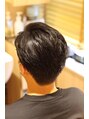 おでこを出すように前髪をしっかりと上げて、眉もキチッと整えてます。髪の毛が硬いので長さを残して後ろに流せるようにカットしてあります。