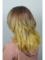 ベージュとイエローのバレイヤージュ風グラデーション。ロングウルフスタイルで軽めのスタイル。