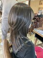 白髪ぼかしハイライトは、優しいブリーチ剤を使い全体に細めにたっぷりとハイライトを入れてから色を被せて染めていきます!明るい部分を先に作る事でコントラストが生まれ、透明感のある色に染めることができます!伸びてきた時も気になりにくい♪