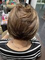 前下がりショートと脱白髪ハイライトです。髪の流れに合わせてハイライト。伸びてきても白髪が気になりにくくなります。