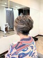 白髪ぼかしハイライト♪コントラストがしっかりつくようにブリーチしてあげると白髪がぼけてよい感じに♪カットは前下がりのショートボブですがトップも短めでボリューム感が出るようにカット。個性的で良くお似合いです。