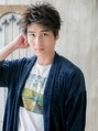 計算された無造作感とマットな質感で、モード&カジュアルに仕上げた無造作ショート。デコ出しアップバングと落ち着いた黒髪で清潔感をアピール。ビジネスでも使えるビジカジにアップデート。オールバックもクール。