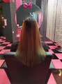 カットは毛先5センチ程切って調節程度に量を クセあるので全体に縮毛矯正 インナーもともとブリーチしてたのをカラーバターで原色グリーン