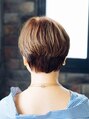 流しセンターパートのハンサムショートボブスタイル。毛先にカールがあるのでカッコすぎず可愛らしさもあるヘアスタイルになっています!前髪伸ばしたいけれど顔にかかるのは嫌という方におすすめのスタイルになっています。〔上大岡/上大岡駅〕